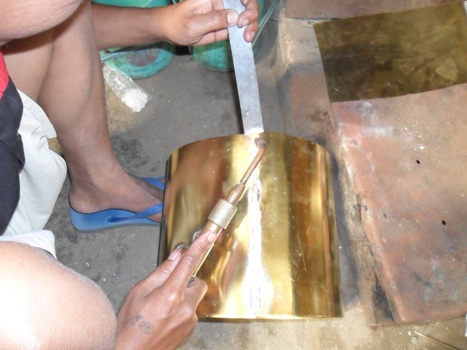 Agar pengelasan dengan cara las gas atau las karbit dapat dilakukan, diperlukan peralatan: tabung gas Oksigen dan tabung gas Asetilen, katup tabung, regulator (pengatur tekanan gas), selang gas dan torch (brander). Gas Oksigen dan Asetilen keluar dari masing-masing tabung dengan tekanan tertentu, mengalir menuju torch melalui regulator dan selang gas. Setelah sampai di torch kedua gas tercampur dan akhirnya keluar dari ujung nosel torch. Dengan bantuan pematik api, campuran gas yang keluar dari ujung nosel membentuk nyala api denagn intensitas tertentu yang nantinya dapat menyatukan plat tembaga sehingga menjadi kerajinan tembaga. Untuk menghasilkan motif atau relief diperlukan pemahatan jadi tidak hanya tehnik las yang diperlukan melainkan tangan terampil dari pengrajin merupakan faktor terpenting dalam menghasilkan sebuah kerajinan tembaga.